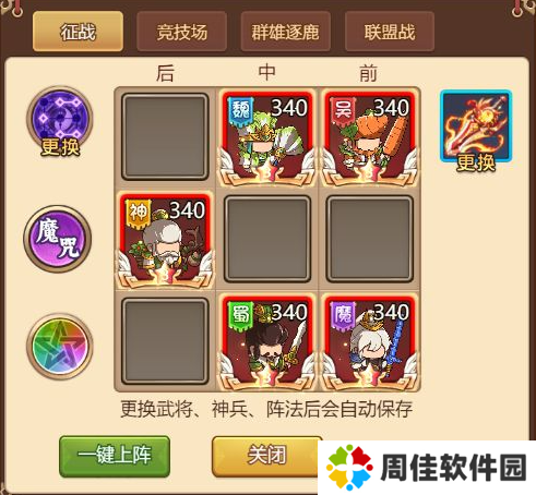 防守方面:神华佗的复活能防止刘备过早被敌方击杀,孙权能让造成暴击伤害时恢复血量以保证血量的健康,魔张辽与司马懿攻击附带负面效果进一步削弱敌方战力。