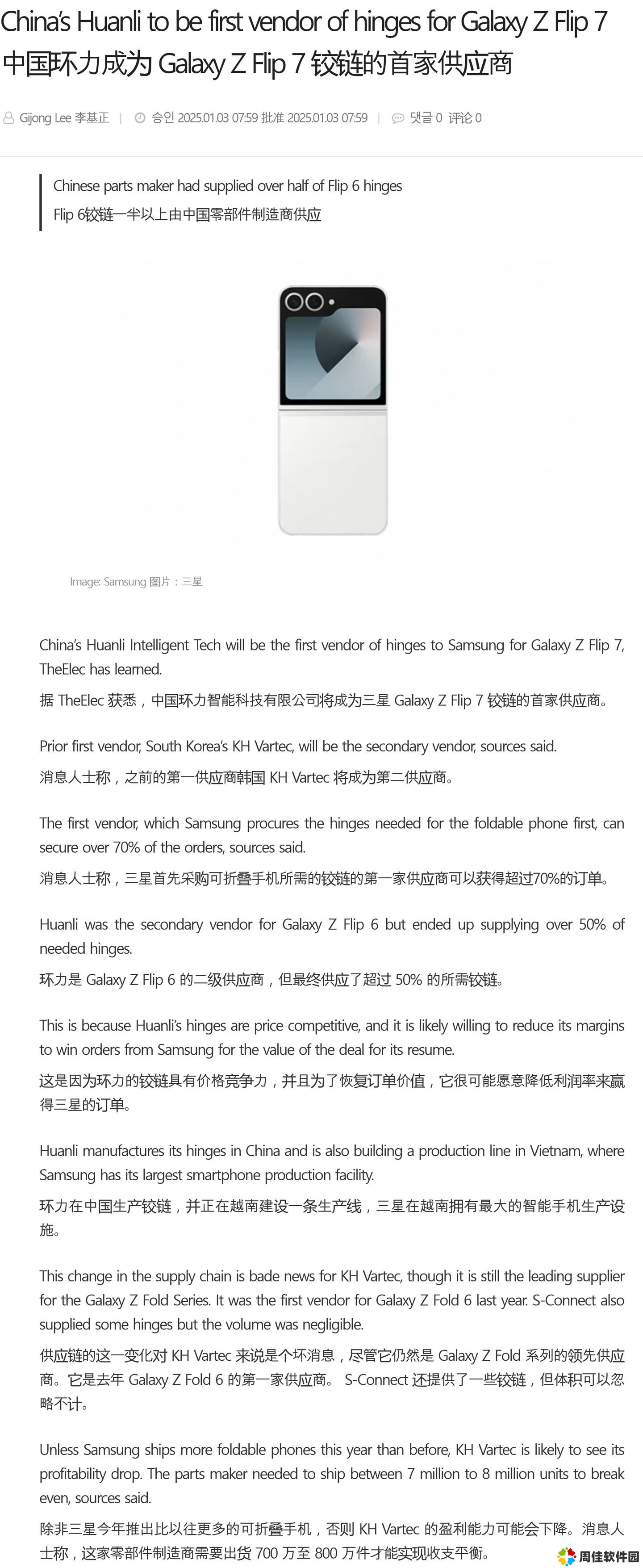 本站 1 月 3 日消息,外媒The Elec发文,透露东莞市环力智能科技有限公司(Huanli Intelligent Tech)成为三星Galaxy Z Flip 7小折叠手机铰链第一供应商,而韩国本土供应商的 KH Vartec将成为第二供应商。