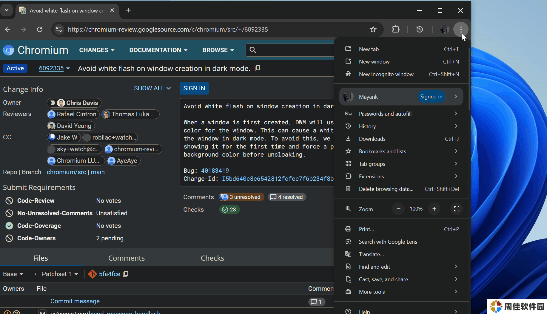 不过,这一问题即将得到解决。浏览器研究员 Leo 在 X 发现,微软已经为 Chromium 提交了补丁,旨在消除深色模式下窗口创建时的白屏问题。