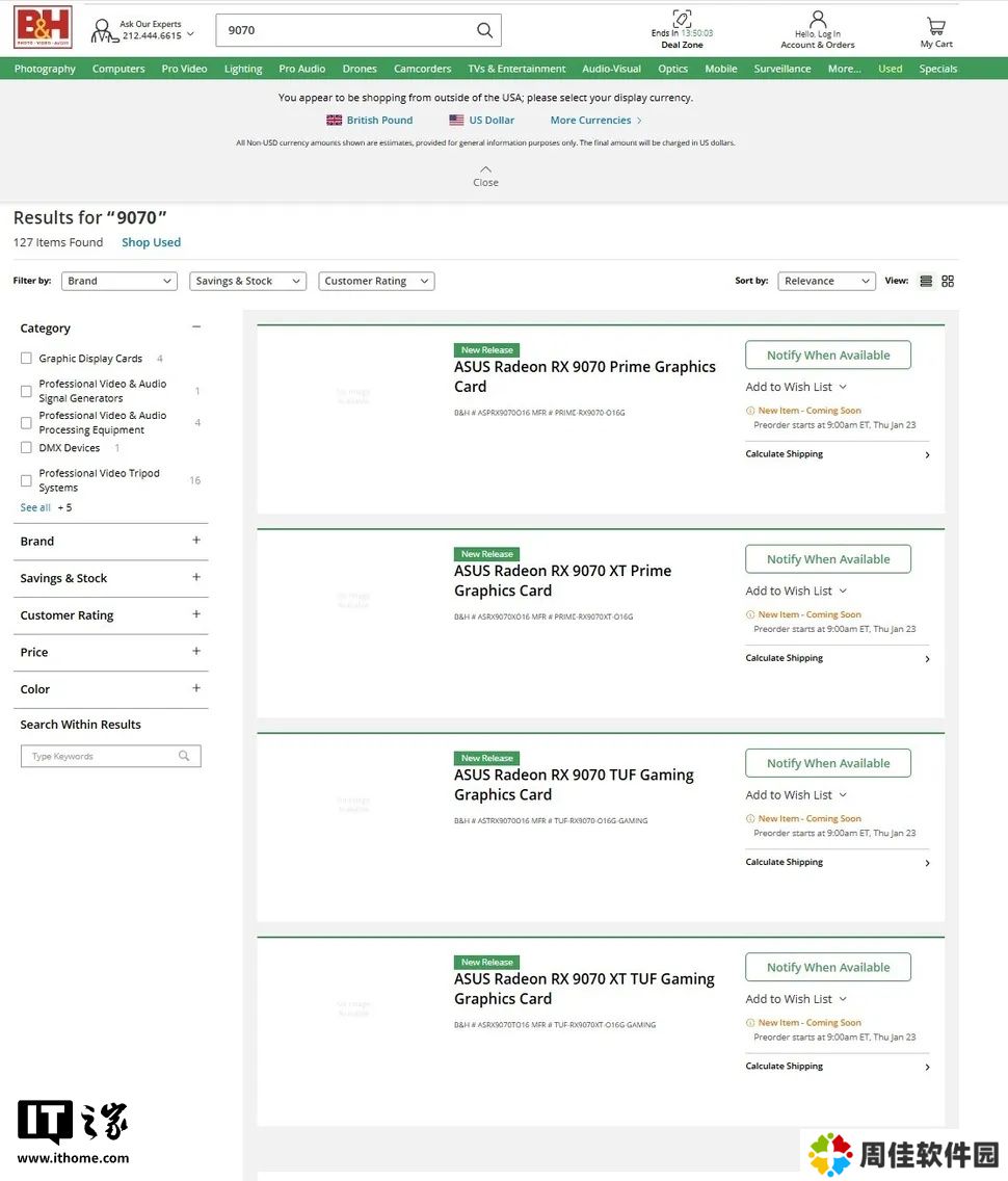今日,美国零售商 B&H 提前上架了华硕 Prime 和 TUF 系列 RX 9070 XT 显卡,显示将于 1 月 23 日开始接受预购。