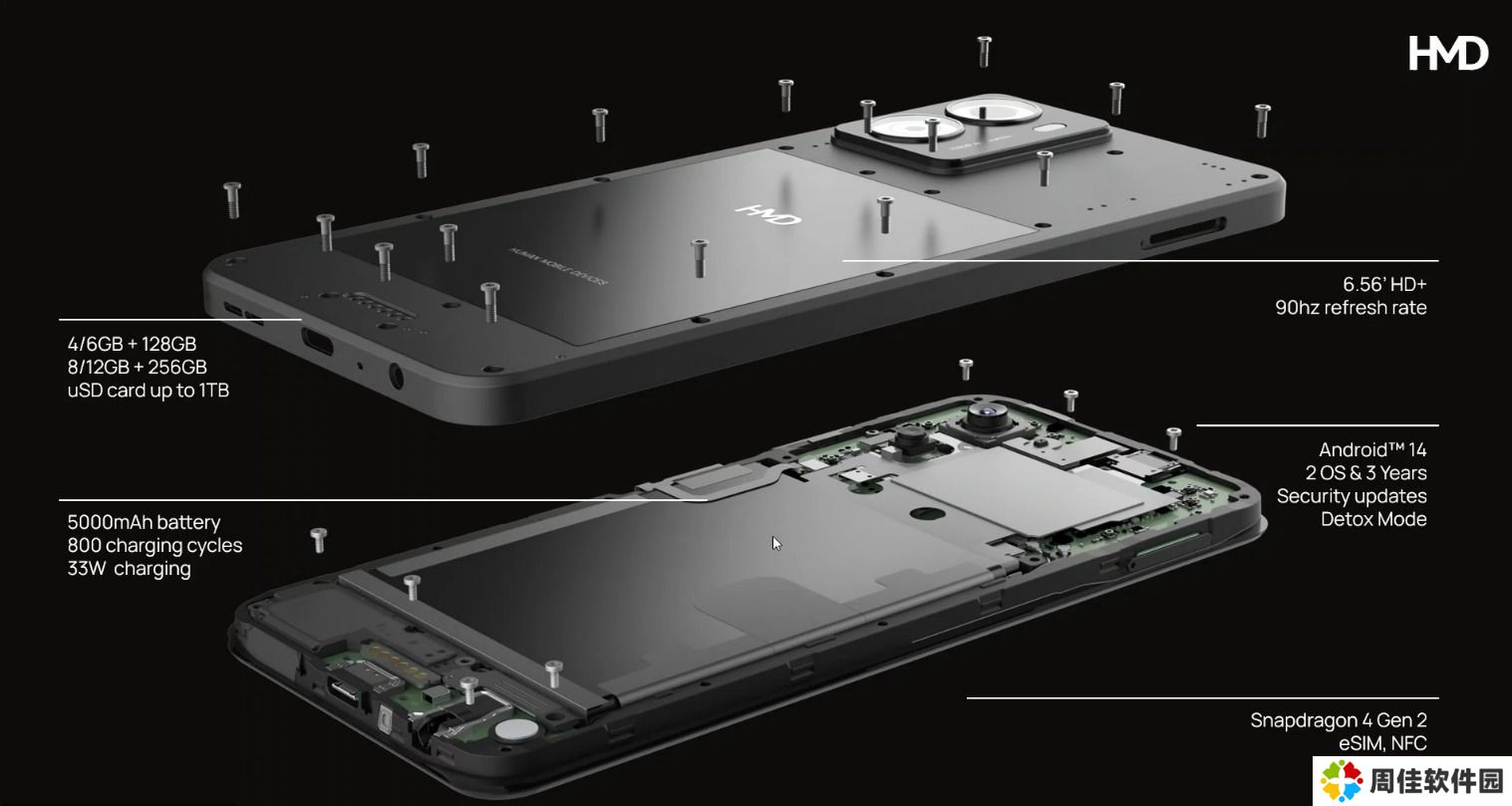 HMD Fusion手机在2024年9月6日发布,该机背面具有Smart Pin 触点,可以连接各种外壳配件,实现从无线充电到更坚固的保护,或者是用于更明亮自拍和直播的环形灯等各种扩充功能,用户还可以通过开源的HMD Fusion开发工具包,3D打印出自己的设计。